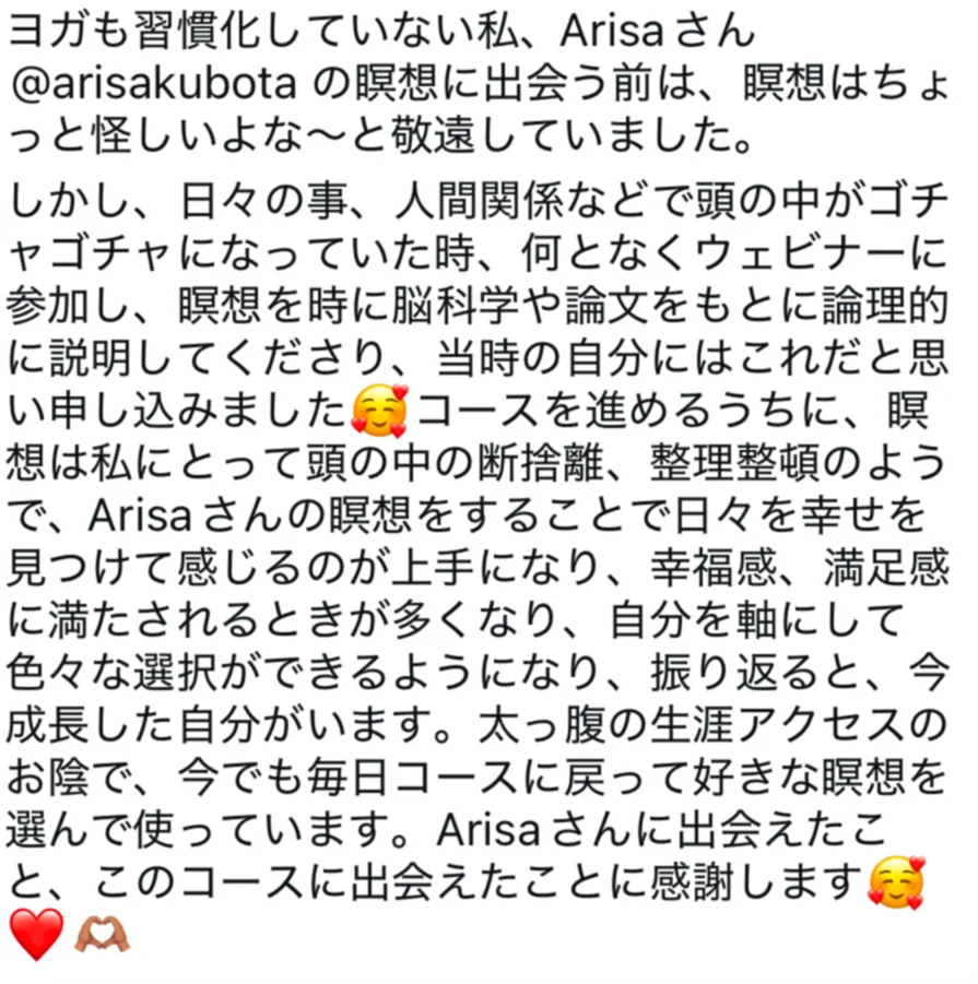 - 瞑想に対する誤解がなくなり、「私でもできる」と思えるようになる