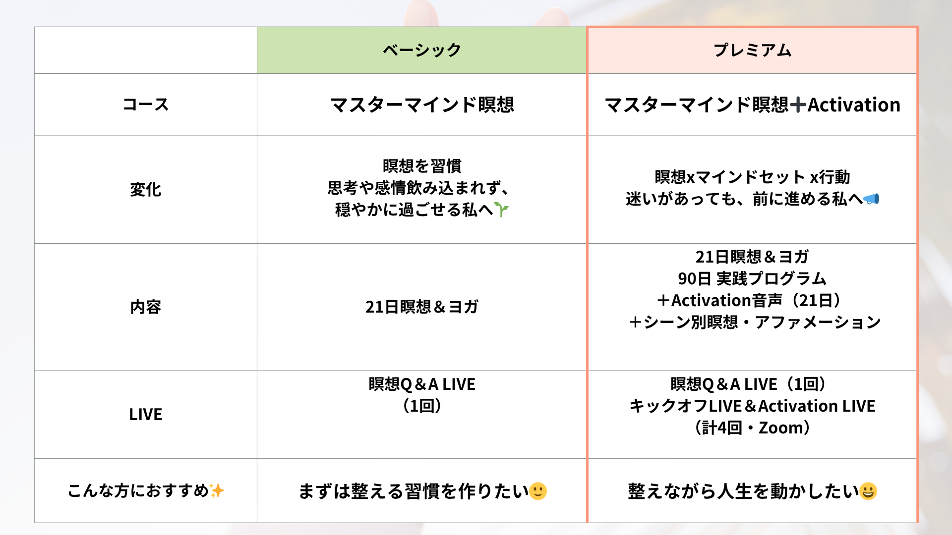 整えるステップ(マスターマインド瞑想&ヨガ)に加えて、その先の“行動と変化”までを含めたプレミアム Activation 実践コースがおすすめです。